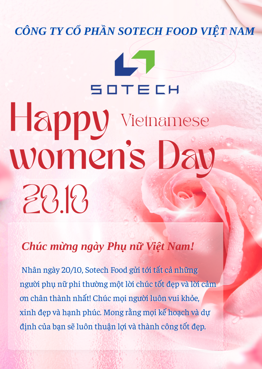 Nhân ngày Phụ nữ Việt Nam 20/10, Ban lãnh đạo và toàn thể đội ngũ Sotech Food Việt Nam xin gửi những lời chúc tốt đẹp nhất và những bó hoa tươi thắm nhất đến toàn thể Phụ nữ Việt Nam.